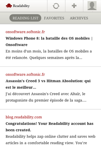 Readability Mobile vous débarrasse des publicités et autres éléments parasites qui gênent la lecture d'une page Web pour ne garder que le texte et les images. L'ajout d'un article se fait simplement en copiant/collant son URL. Les articles que vous lisez peuvent être classés sous trois onglets: liste de lecture, favoris et archives.